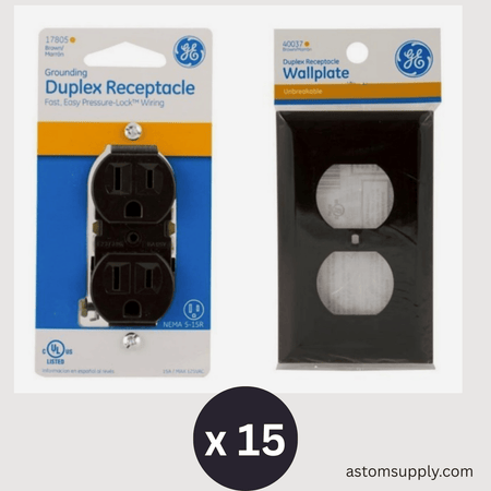 This is a bulk lot of 15 new GE duplex receptacles, each matched with its own wallplate. Perfect for electricians, contractors, or renovation projects needing high-quality UL/cULus-certified outlets approved for both Canada and the U.S.