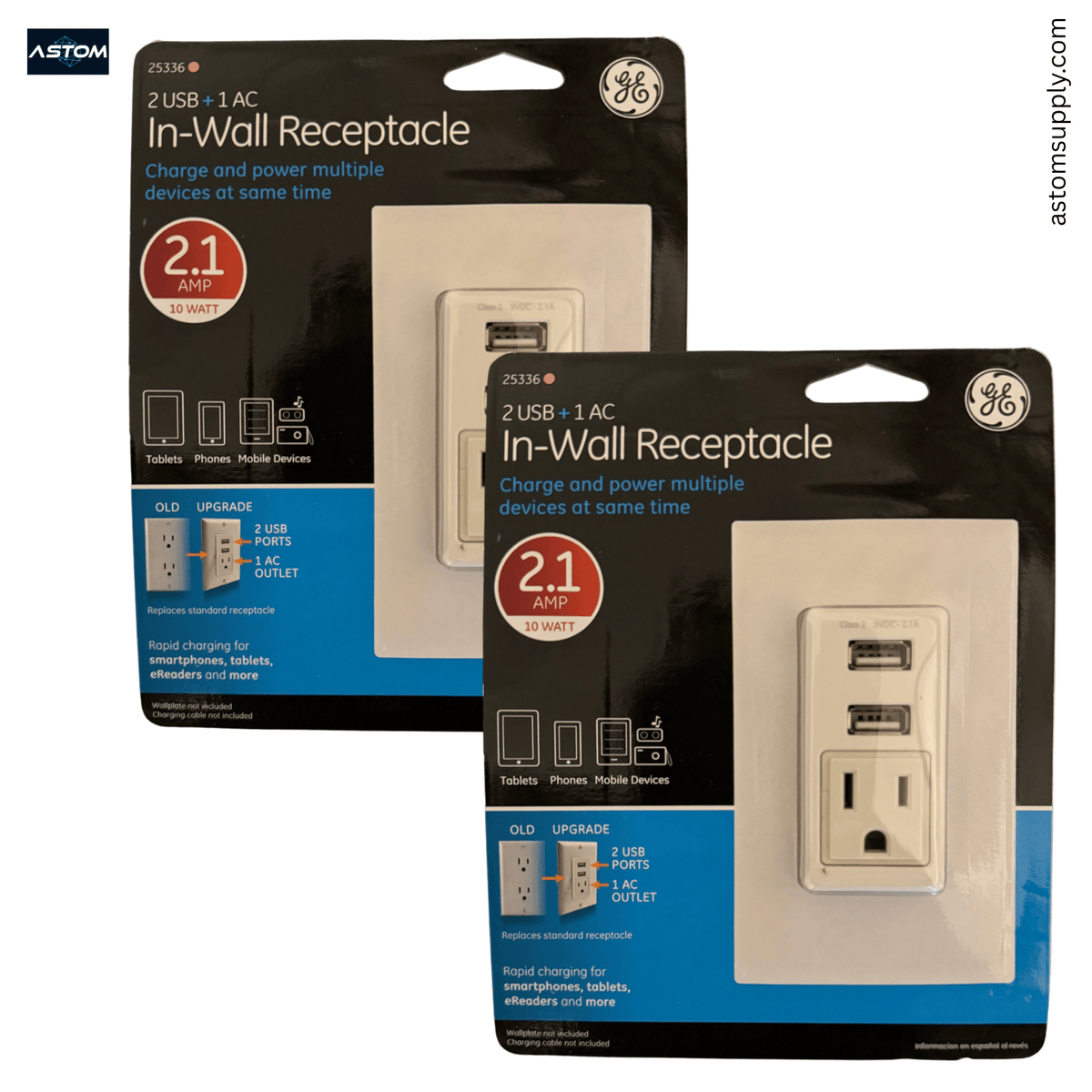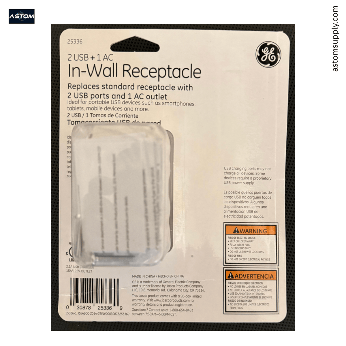 GE 25336 In-Wall Receptacle – 2 USB Ports + 1 Standard AC Outlet – USB Charger 2.1A / 10W (Model GE8033 / Code 030878253369)