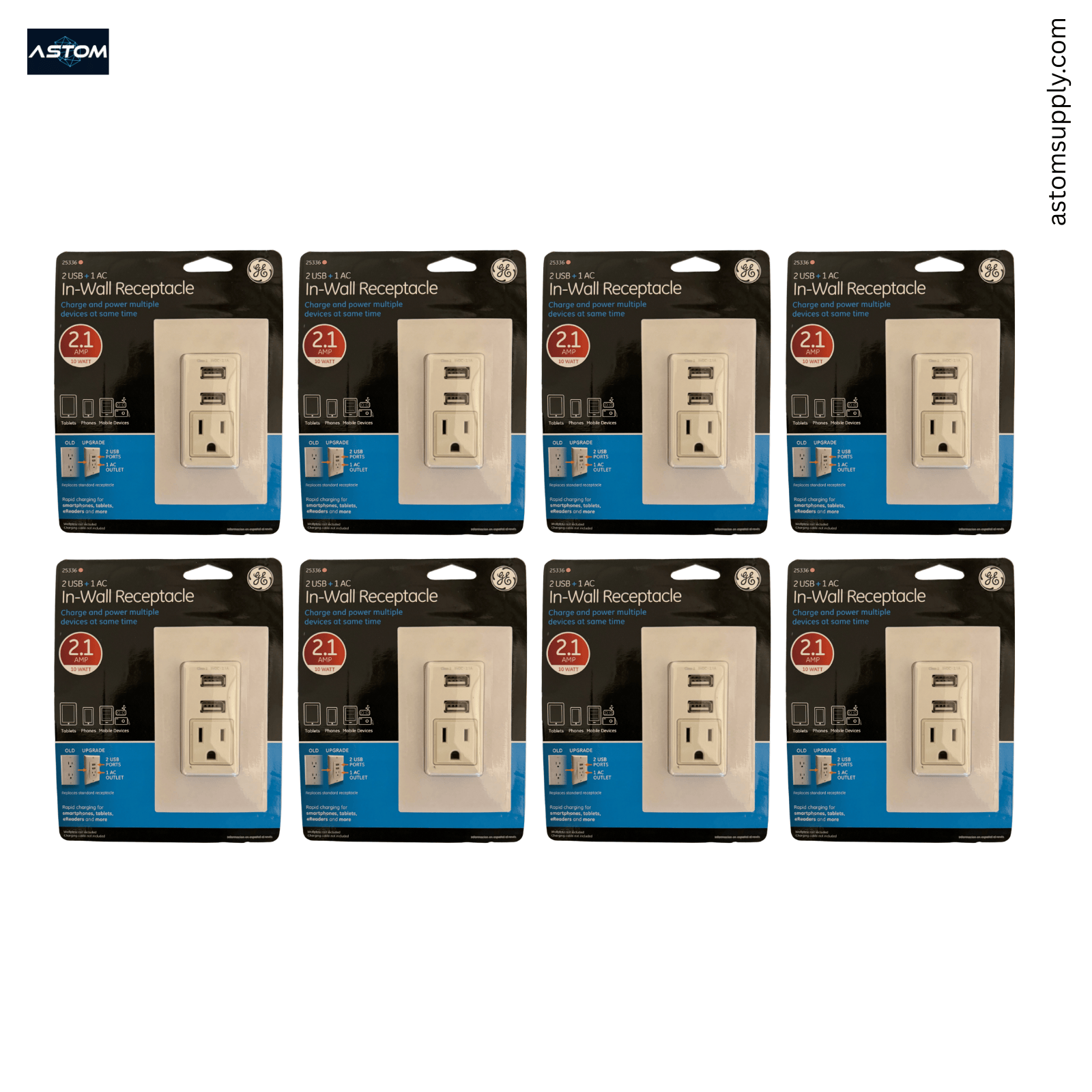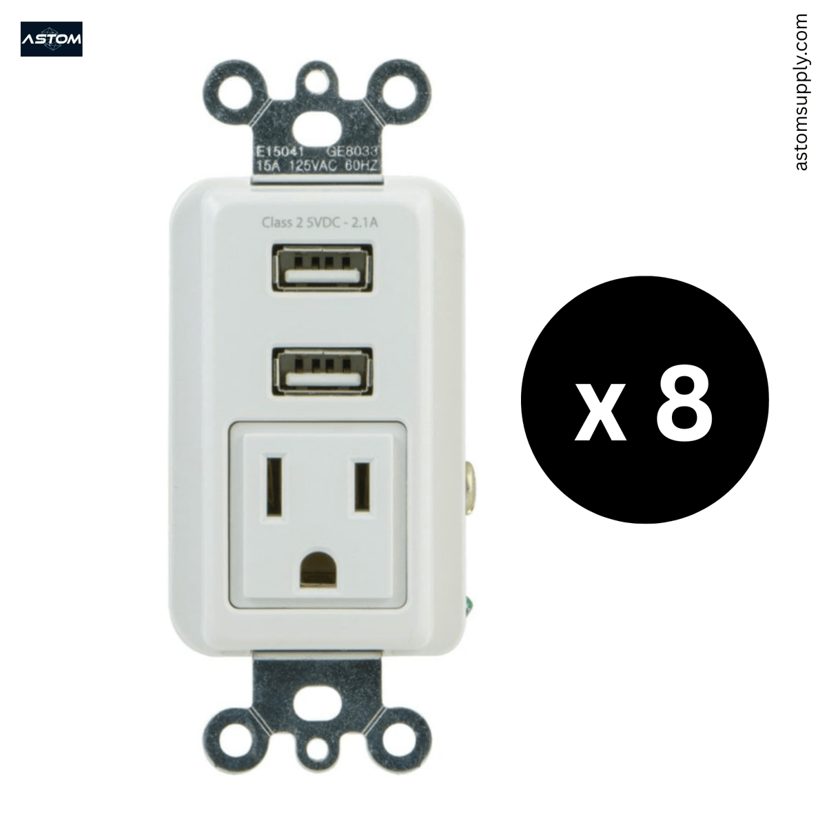 (Pack with 8 ) GE 25336 Wall Outlet Charger 2 USB Ports 2.1A + 1 AC 15A 125V